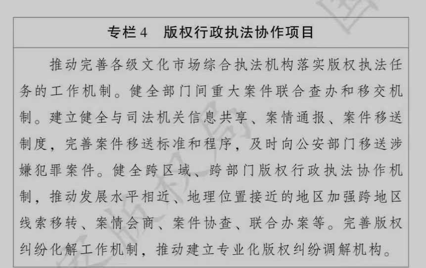 3. 加強版權執法協作。進一步加強對文化市場綜合執法機構的指導,有效發揮文化市場綜合執法機構的版權執法職能。加強與工信、公安、海關、市場監管、網信等部門的執法協作。鞏固加強兩法銜接機制,進一步推動版權行政執法與刑事司法的有效銜接。在案件多發地區探索建立仲裁、調解優先推薦機制。建立健全版權案件分流制度,推進案件繁簡分流機制改革。充分發揮全國打擊侵權假冒領域行政執法與刑事司法銜接工作信息共享平臺和國家版權監管平臺的作用,加強數據管理和有效應用,提高銜接工作效率和規范化水平。