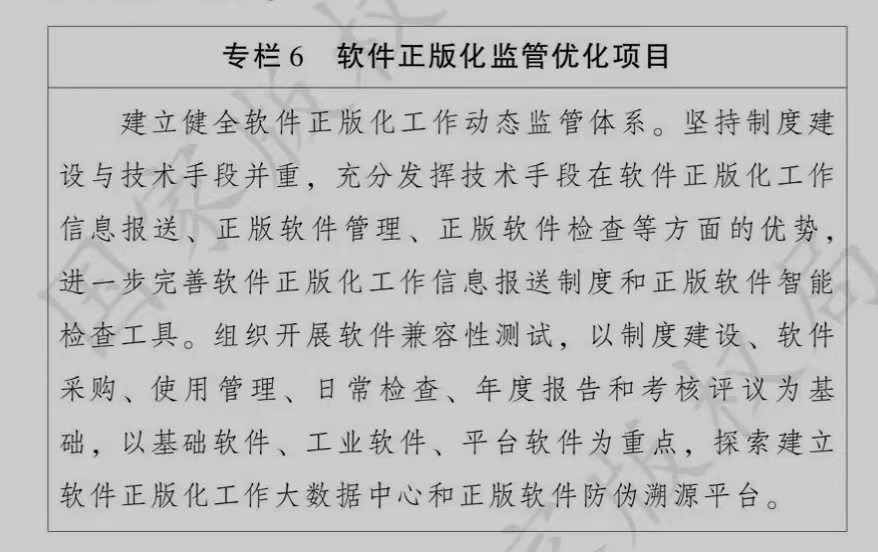 1.鞏固完善軟件正版化工作制度。充分發揮制度引領作用,鞏固完善推進使用正版軟件工作部際聯席會議等軟件正版化工作制度。加強推進使用正版軟件工作部際聯席會議成員單位協調配合,提升聯合監管效能。推動各地區各部門進一步完善軟件正版化工作機制和督查考核等制度。