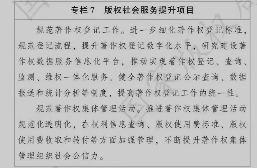 完善版權社會服務體系,優化版權社會服務體制機制,創新工作方式方法,引導和規范版權社會服務機構建設,全面提升版權社會服務能力。