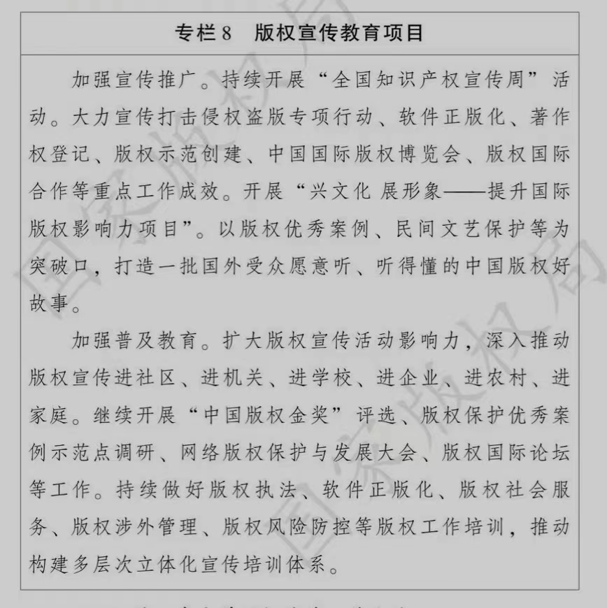 5. 加強版權宣傳引導。把貫徹落實黨中央、國務院的戰略決策部署作為版權宣傳工作的著眼點,建設常態化、立體化和精準化的版權宣傳機制。綜合運用多種媒體形態,不斷提升版權宣傳的生動性和有效性,及時準確回應社會關注、產業關切、群眾關心的版權熱點焦點問題,營造尊重版權的良好文化氛圍,提高全社會版權意識。強化版權涉外宣傳工作,進一步提升版權國際傳播力,以塑造良好形象、維護國家利益、傳播中華優秀傳統文化為主要任務,把握大勢、區分對象、精準施策,助力提高國家文化軟實力和中華文化影響力。通過國家版權局英文網站、版權重點事件、多雙邊交流場合等開展日常對外宣傳,主動發聲,增信釋疑。繼續與世界知識產權組織開展版權保護優秀案例示范點調研項目,并通過世界知識產權組織等國際多邊平臺貢獻中國智慧和中國方案。