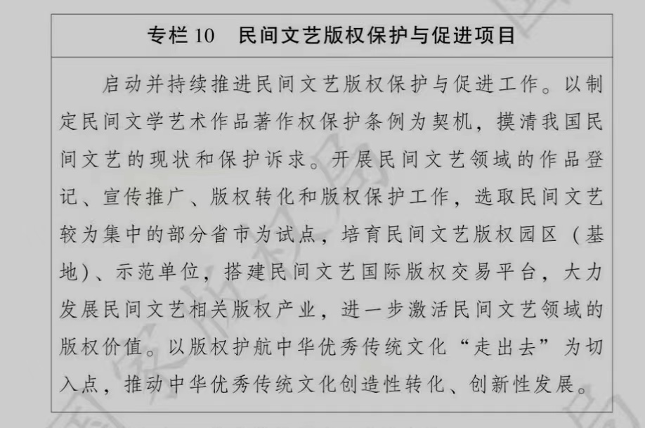 3.推動民間文藝版權保護國內立法實踐和國際推廣聯動。堅持文化自信,依托國內豐富的多民族和民間文藝資源,堅持交流互鑒、開放包容、以我為主、為我所用的原則,推動完善民間文藝版權保護國內立法,著力解決我國在傳統文化表現形式的傳承、利用、保護和弘揚等方面存在的版權問題,大力發展民間文藝相關版權產業。積極推動國際民間文藝版權對話交流,以國內立法和實踐經驗為基礎,深度參與相關國際規則制定,貢獻中國經驗和中國智慧。