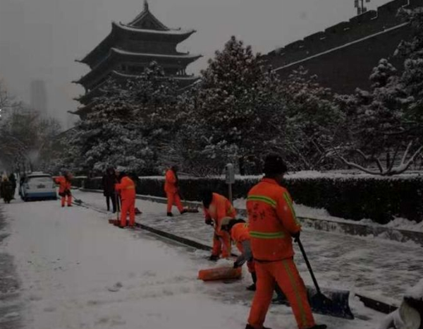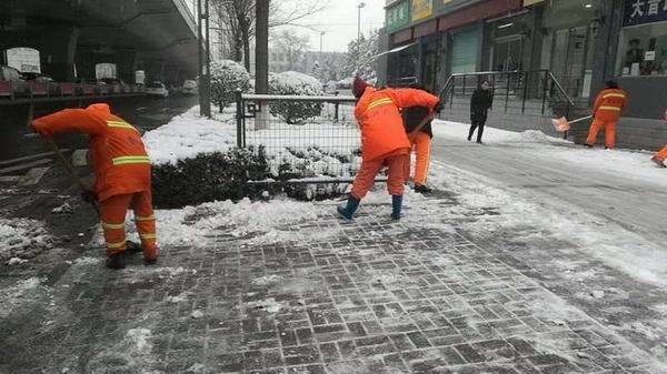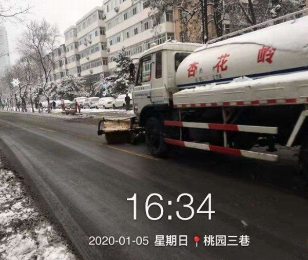第一時間在新建路、旱西關街、東緝虎營、解放路、府西街、桃源片區以及高架、立交橋、匝道等重點道路和區域撒布融雪劑顆粒,人機結合清雪除雪,確保道路通暢。