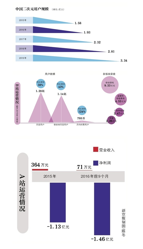 一位二次元領域資深從業者告訴新京報記者,A站一直比較講“情懷”,“堅持不向用戶收費”,商業化運營十分有限。而B站則在移動游戲、廣告、直播和增值服務等領域多點開花。“現階段二次元領域動畫、漫畫更加利于吸引用戶,但變現能力有限,通常以游戲、直播業務完成收割,但A站空有前者的黏性,沒有后續的收割。”