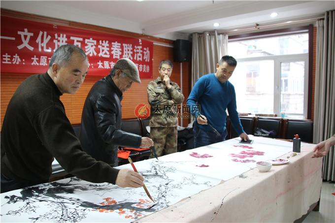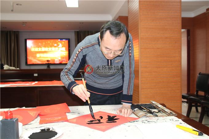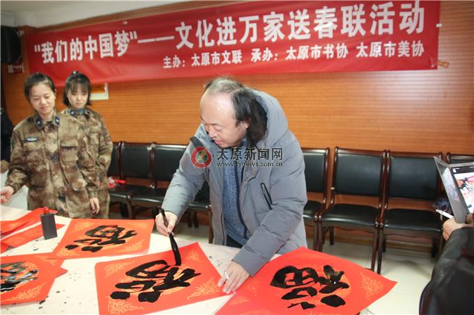 太原新聞網訊 近日,由太原市文聯(lián)主辦,太原市書法家協(xié)會、美術家協(xié)會承辦的“我們的中國夢——文化進萬家”送春聯(lián)活動走進山西省軍區(qū)太原第二離職干部休養(yǎng)所,為部隊離休干部和子弟兵送去新春的問候與祝福。市文聯(lián)黨組成員、副主席王宏偉帶領市書協(xié)、市美協(xié)多位藝術家參加活動。