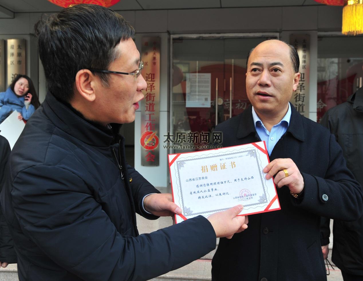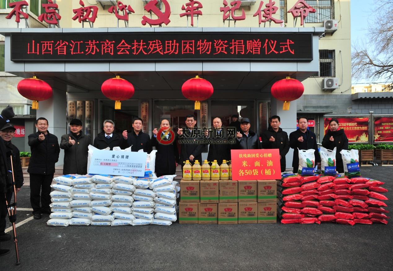 太原新聞網訊(記者 單斌)2020年1月14日上午,山西省江蘇商會攜手山西省殘疾人福利基金會,在太原市迎澤區街道辦事處舉行扶殘助困捐贈慰問活動。山西省江蘇商會會長范榮亮、山西省殘聯黨組成員、副理事長李俊溫、山西省殘疾人福利基金會秘書長董先、太原市殘聯副理事長薛曉峰、太原市迎澤區副區長王國棟、太原市迎澤區殘聯理事長杜永生,以及山西省江蘇商會會員單位蘇酒集團太原市辦事處主任劉正剛等捐助單位也參加了捐助活動。