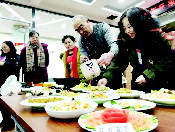 當天上午,63歲的何金林和50歲的王文麗端來了她們合作的4道涼菜。干豆皮擺成菊花造型,再以芹菜葉打底,取名“青蔥歲月”。剖開蒜薹,束以紅色小米椒,就像中國結,取名“吉祥結”。番茄削成一片片疊成“花瓣”,番茄皮作花蕊,周圍以心型黃瓜片點綴,便是“花開富貴”。冰糖橘一分為二,飾以橘子葉,名曰“橘子燈籠”。這些賞心悅目的菜肴,令人不由得垂涎欲滴。