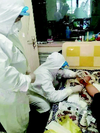 1月28日,尖草坪區屬中西醫結合醫院黨支部書記賈國瑞與黨支部委員、外科主任齊昌業身著防護服,來到一戶居民家中,為一位從武漢歸來的大學生提供醫療服務。這位學生左腿骨折,在武漢手術后回到太原。由于隔離觀察,后期的換藥護理等問題難住了家人。尖草坪區醫護人員則給全家人吃下了定心丸——定期上門服務。