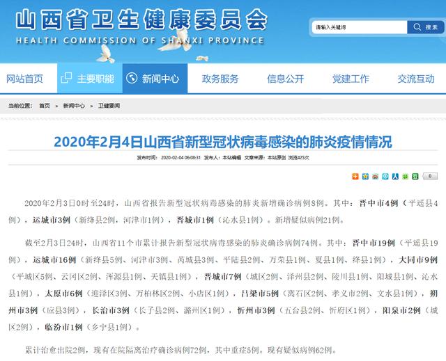 2020年2月3日0時至24時,山西省報告新型冠狀病毒感染的肺炎新增確診病例8例。其中:晉中市4例(平遙縣4例),運城市3例(新絳縣2例,河津市1例),晉城市1例(沁水縣1例)。新增疑似病例21例。