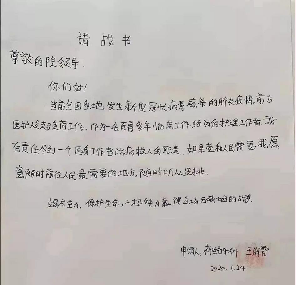 時間回到1月23號,王海霞看到科室工作群里發出需要支援武漢醫療隊的通知后,她毫不猶豫主動請纓,寫下請愿書。