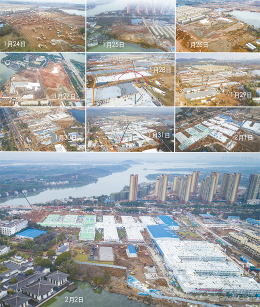 這張標注了日期的拼版照片顯示的是武漢火神山醫院從開始設計到建成完工的過程,歷時10天(無人機拍攝)。 新華社記者肖藝九攝