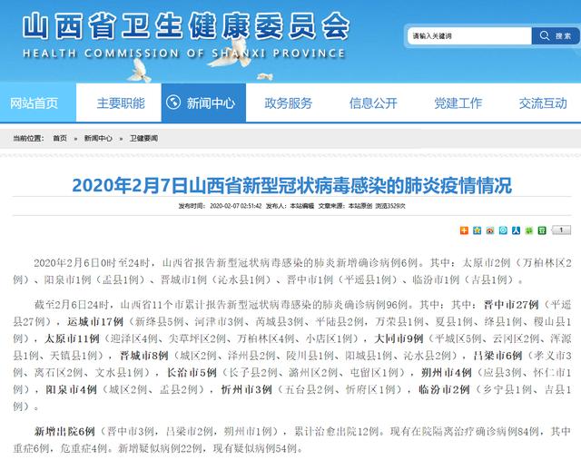 新增出院6例(晉中市3例,呂梁市2例,朔州市1例),累計治愈出院12例。現有在院隔離治療確診病例84例,其中重癥6例,危重癥4例。新增疑似病例22例,現有疑似病例54例。