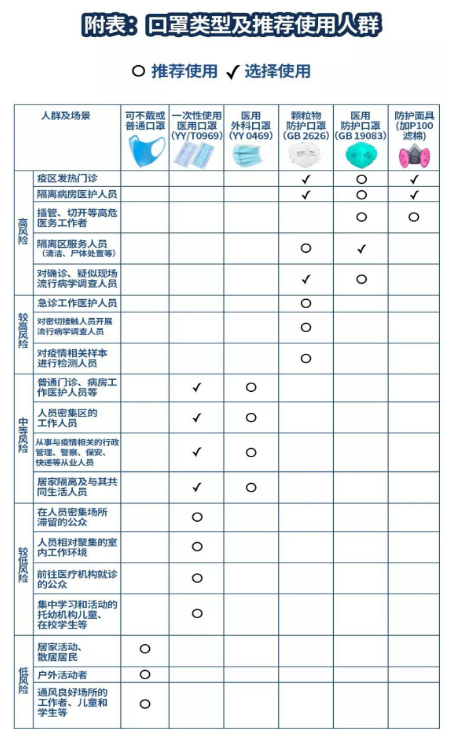 在新型冠狀病毒感染的肺炎流行期間,山西省醫院感染管理質量控制中心主任、省人民醫院感染管理科主任、主任醫師李臨平建議大家選擇合適的口罩類型,不過度防護。按防疫工作性質和風險等級提出以下指引:
