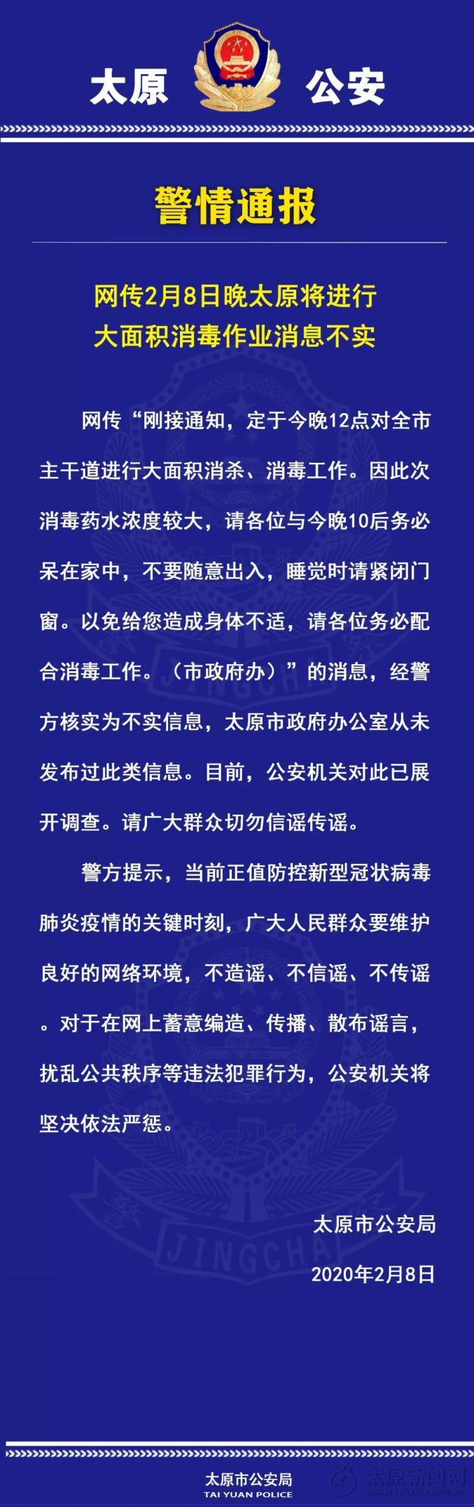 網傳“剛接通知,定于今晚(2月8日)12點對全市主干道進行大面積消殺、消毒工作。因此次消毒藥水濃度較大,請各位與今晚(2月8日)10后務必呆在家中,不要隨意出入,睡覺時請緊閉門窗。以免給您造成身體不適,請各位務必配合消毒工作。(市政府辦)”的消息,經警方核實為不實信息,太原市政府辦公室從未發布過此類信息。目前,公安機關對此已展開調查。請廣大群眾切勿信謠傳謠。