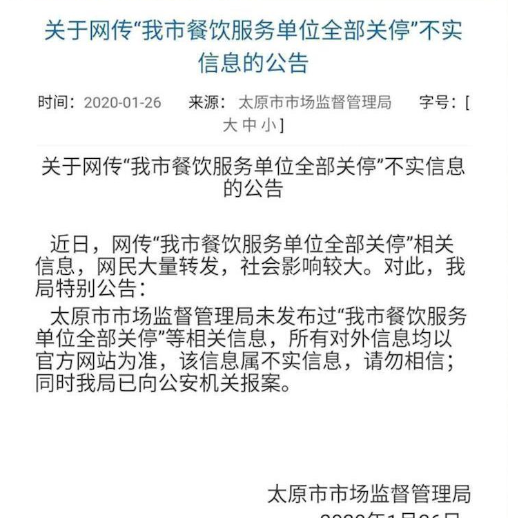 1月26日,山西太原多個微信群流傳市場監管局的“公告”,稱因疫情防控需要,根據《傳染病防治法》第四十二條規定,即日起至疫情解除,所有餐飲單位全部關停。26日,太原市市場監管局發布公告稱網傳信息不實,該局已向公安機關報案。