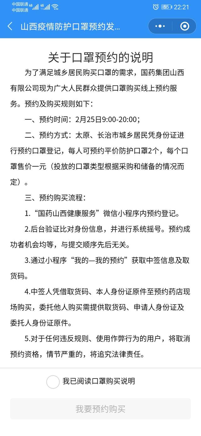 記者從山西疫情防護口罩預約發售平臺了解到,平臺將于2月25日9:00啟動太原市、長治市口罩預約發售,預約時間:2020年2月25日9:00— 20:00,兩市城鄉居民憑身份證進行預約口罩登記,每人可預約平價防護口罩2個,每個口罩售價一元,投放的口罩類型根據采購和儲備的情況而定。