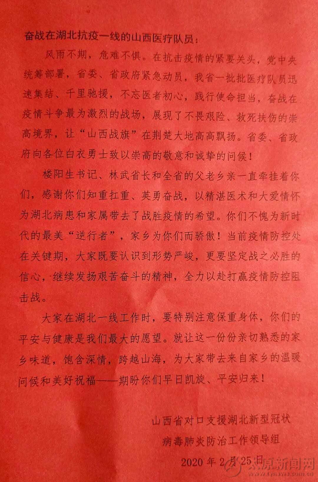 今天收到了來自山西省對口支援湖北新型冠狀病毒肺炎防治工作領導組的慰問信,帶來樓陽生書記和林武省長以及山西父老鄉親的溫暖和問候,使我們倍受鼓舞,我們一定不辱使命,疫情不退,我們不退,堅決打贏疫情阻擊戰!