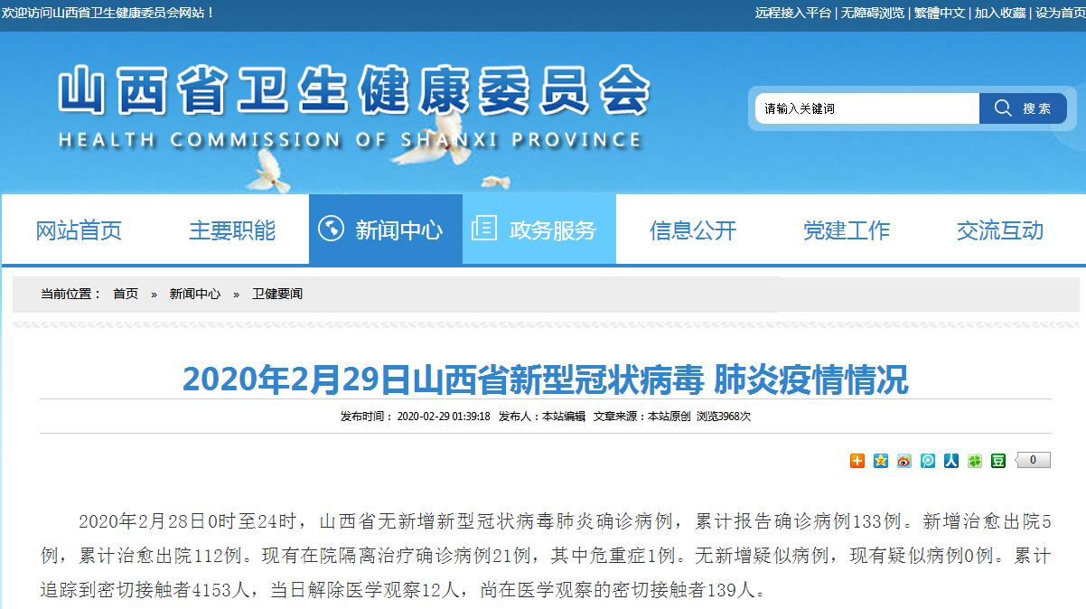 2020年2月28日0時至24時,山西省無新增新型冠狀病毒肺炎確診病例,累計(jì)報告確診病例133例。新增治愈出院5例,累計(jì)治愈出院112例?,F(xiàn)有在院隔離治療確診病例21例,其中危重癥1例。無新增疑似病例,現(xiàn)有疑似病例0例。累計(jì)追蹤到密切接觸者4153人,當(dāng)日解除醫(yī)學(xué)觀察12人,尚在醫(yī)學(xué)觀察的密切接觸者139人。