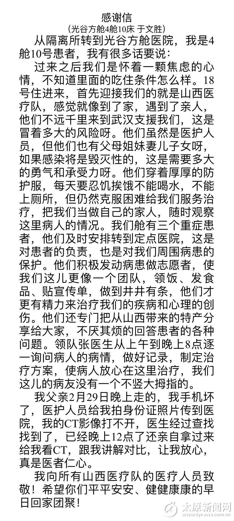 “張開慈祥的雙翅,飛向溫暖的他鄉,陪人間一起面對,陪痛苦一起度過?!?月2日,援鄂山西醫療隊員李雁梅收到了一封感謝信,來自于光谷方艙醫院4艙10號患者。他在信中感謝道:山西醫療隊員們每日穿著厚厚的防護服,忍饑挨餓不能喝水,不能上廁所,但仍然克服困難給我們服務治療,把我們當做自己的家人,醫者仁心??!