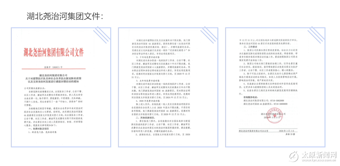 對湖北省外援鄂醫(yī)療隊員及家屬終身不限次數(shù),免門票游覽堯治河國家4A旅游景區(qū),提供免費住宿(在堯治河景區(qū)內(nèi)的堯治河集團所屬賓館、酒店),并贈送旅游紀念品。憑湖北省文化和旅游廳負責統(tǒng)一制作“靈秀湖北感恩卡”和身份證等證件進入景區(qū),享受此項優(yōu)惠項目。