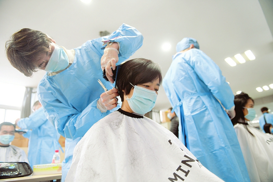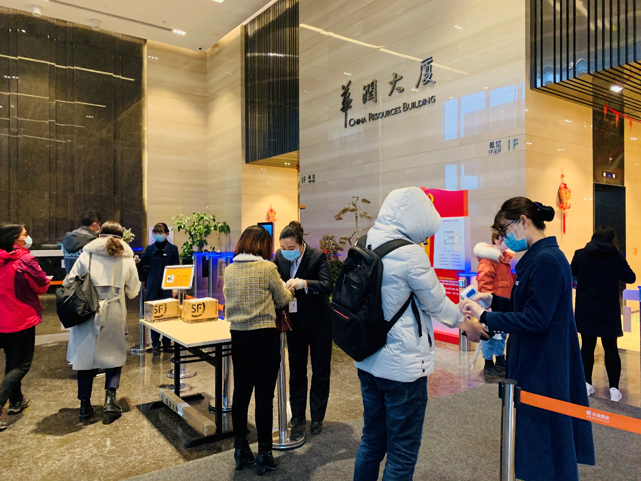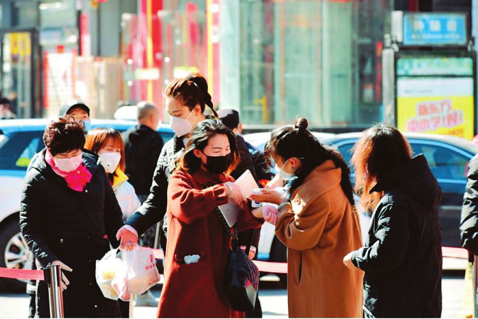 太原食品街部分商戶復工,女子防控隊隊員在入口處為市民測量體溫。