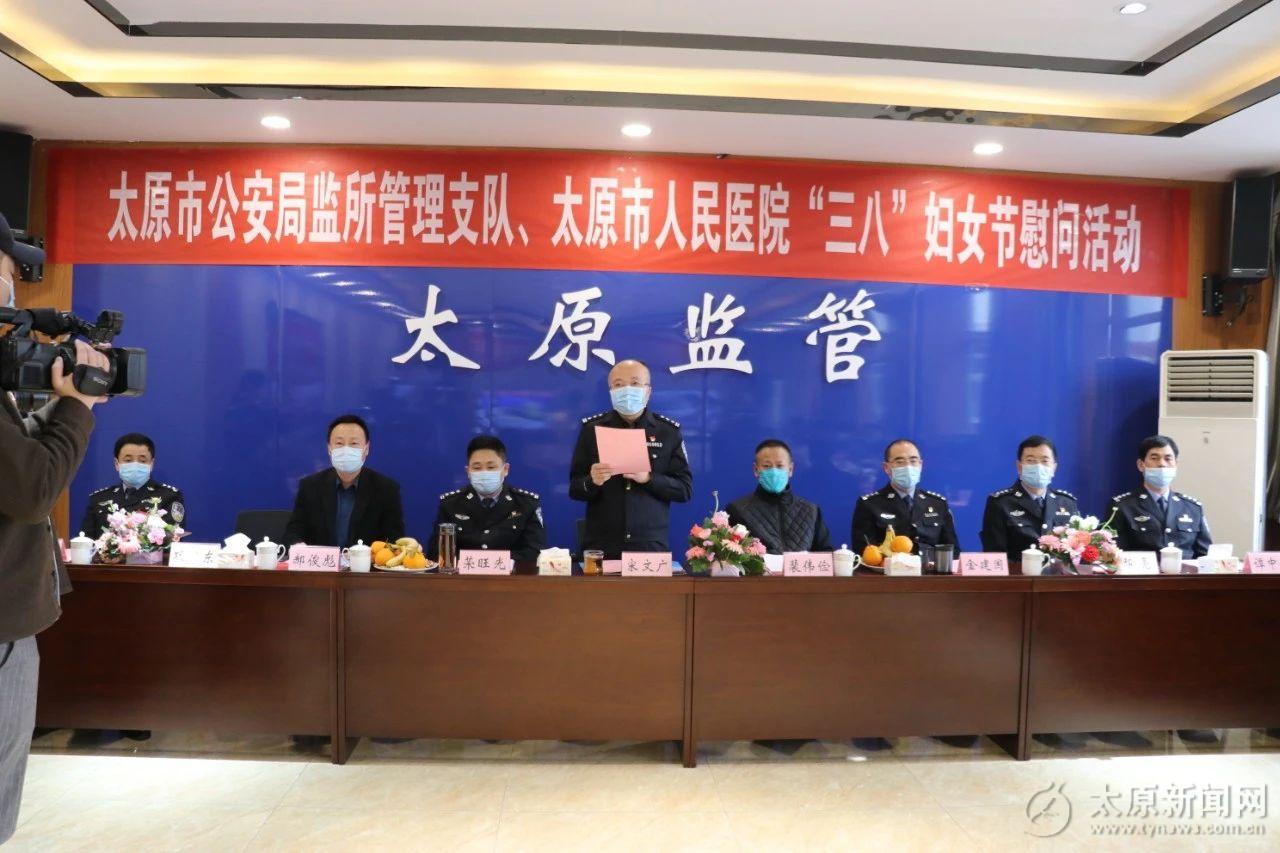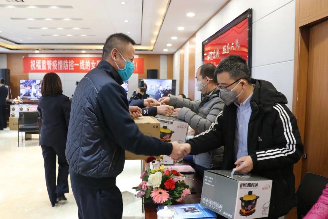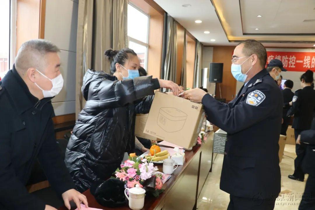 太原市公安局黨委委員、副局長宋文廣與太原市人民醫院院長裴偉儉向疫情防控一線參戰女同志及家屬們發放慰問品。