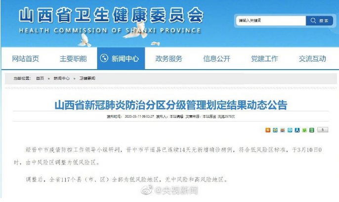 今天,記者從山西衛健委獲悉:經山西晉中市疫情防控工作領導小組研判,晉中市平遙縣已連續14天無新增確診病例,符合低風險區標準,于3月10日0時,由中風險區調整為低風險區。調整后,山西全省117個縣(市、區)全部為低風險地區,無中風險和高風險地區。