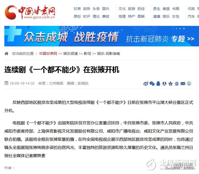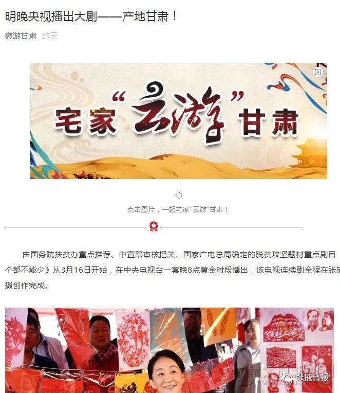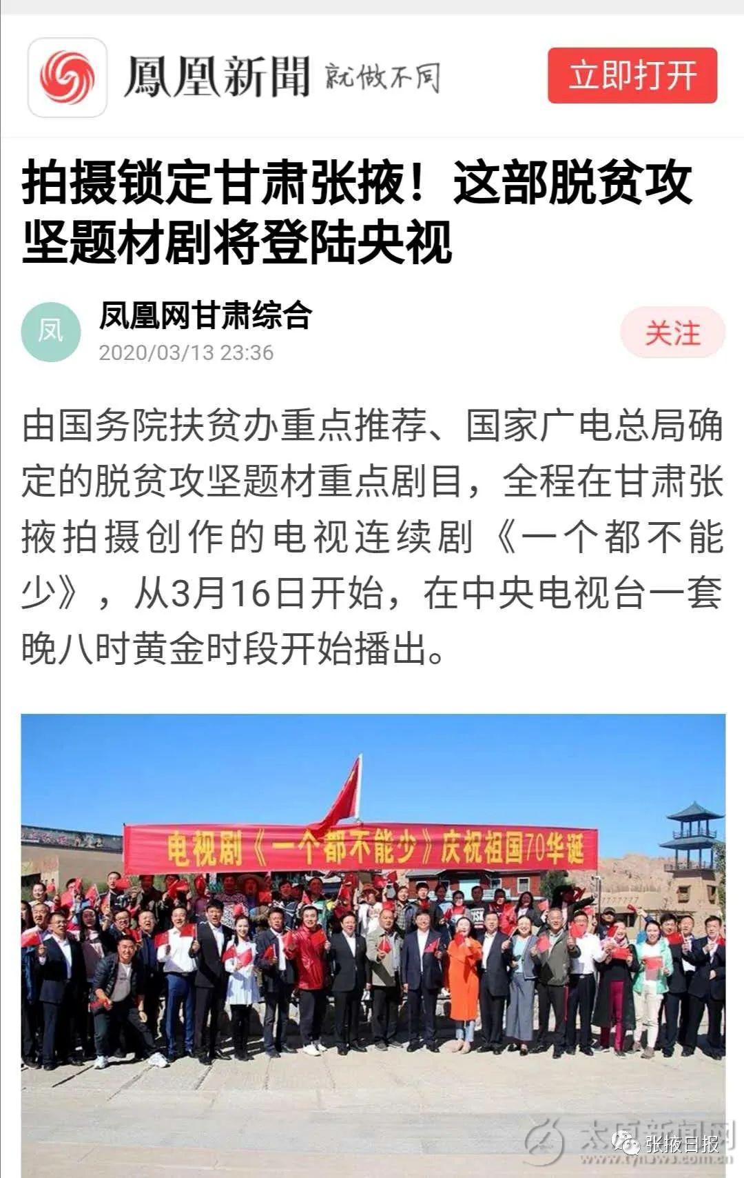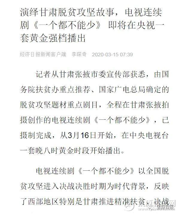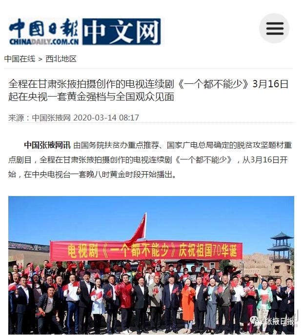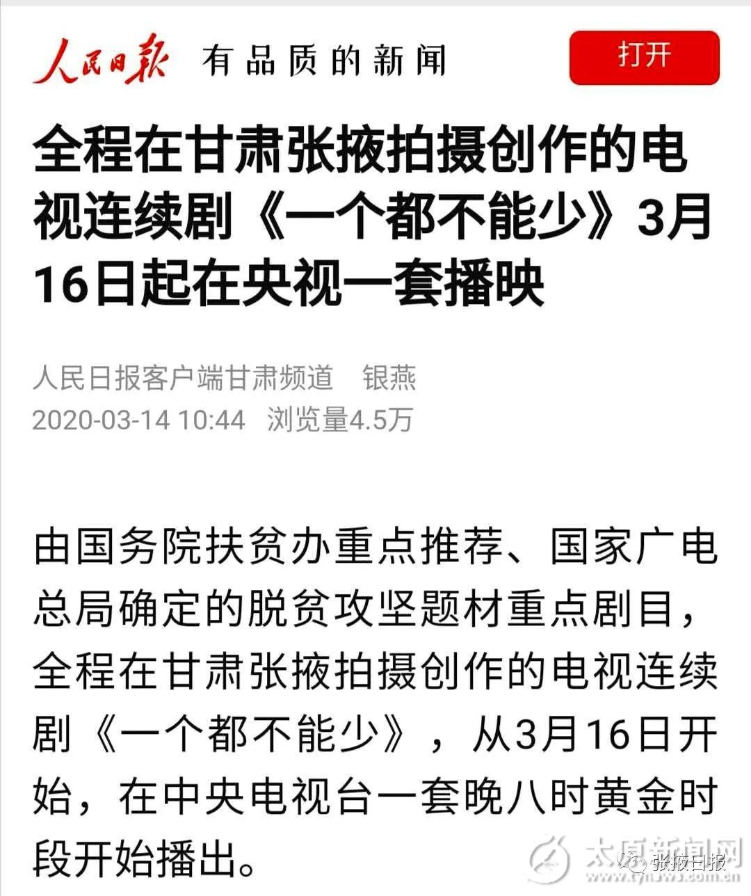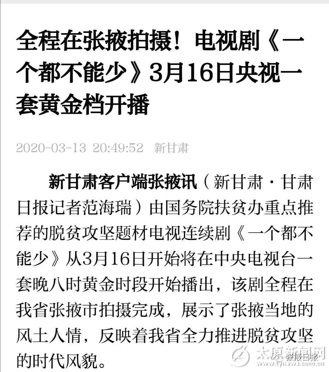 中國張掖網(wǎng)訊 據(jù)張掖日?qǐng)?bào)報(bào)道(記者陳露喬偉)由國務(wù)院扶貧辦重點(diǎn)推薦、國家廣電總局確定的脫貧攻堅(jiān)題材重點(diǎn)劇目,全程在甘肅張掖拍攝創(chuàng)作的電視連續(xù)劇《一個(gè)都不能少》,將于3月16日在央視一套晚八時(shí)黃金檔與廣大觀眾見面。