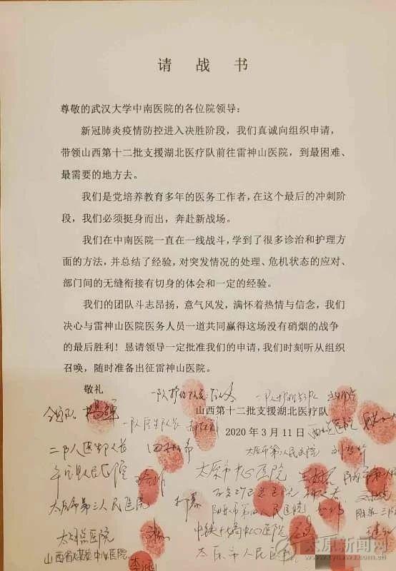3月11日,山西省第十二批支援湖北醫療隊圓滿地完成了武漢大學中南醫院的救護工作,全體隊員又紛紛在請戰書,醫療隊旗上簽字,請戰去最困難、最需要的地方——武漢雷神山醫院,這也是山西首批進駐雷神山醫院的醫療隊,我們要用我們的專業知識去幫助更多的患者。
