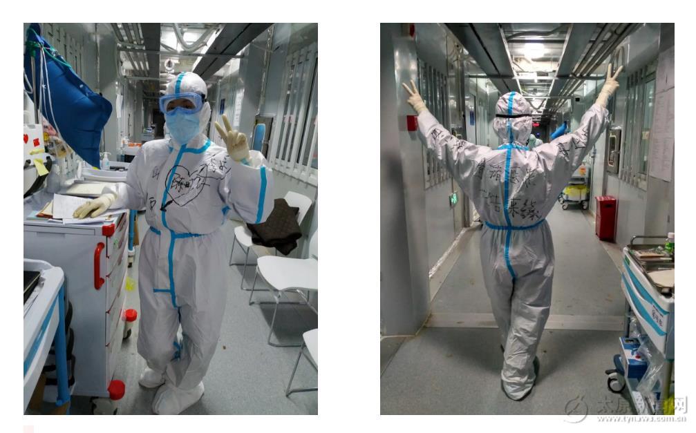 這次在武漢的戰斗還有所不同,我的老公是一名共產黨員,一名醫務工作者,一名熱血青年,也想沖到抗疫第一線,不畏艱辛,甘愿奉獻自己的一切。來到武漢戰場的這一個月,是你給我勇氣,給我力量,默默地在背后支持我。今天進病區前我特意把你的名字寫在防護服上,我要帶著你的夢想,一同踏入隔離病房,實現你的夢想,我們一起戰斗!