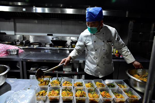 中午12時,星海灣大酒店廚房內,一位戴著口罩的廚師將涼拌豆芽、炒豆角、自制醬牛肉依次盛入餐盒之中,另一位廚師也正在將煮熟的面條往一個個餐盒里分裝。