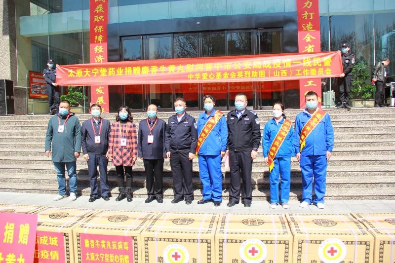 3月19日上午,大寧堂“戰疫情捐獻活動”行動小組一行6人,隨行貨車依維柯裝載著共計16896盒、價值101.376萬元的鎮堂之寶、非遺國粹----“小安宮”麝香牛黃丸由廠區駛出直奔晉中。行動小組與中華愛心基金會英烈助困(山西)工作委員會攜手攜手,慰問一線公安民警,將這批防疫藥品,捐獻給市公安局。