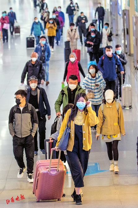 4月11日,山西省多所高校畢業年級學生返校,太原火車站、太原南站迎來學生返程高峰。學生們拖著大小行李箱井然有序地出站進站,等候返校。