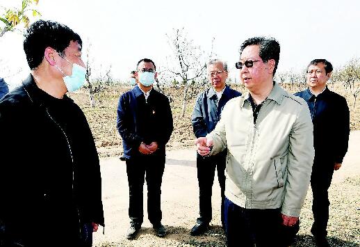 4月15日,省委書記樓陽生查看石樓縣靈泉鎮馬村經濟林提質增效生態扶貧項目,與造林合作社負責人進行交流。李聯軍攝