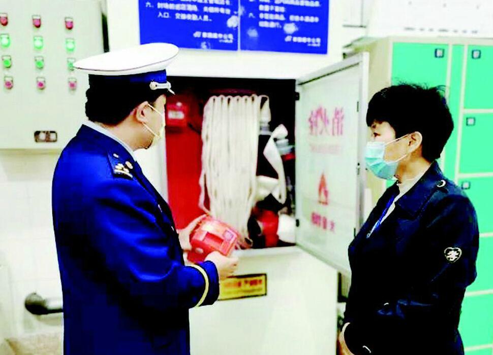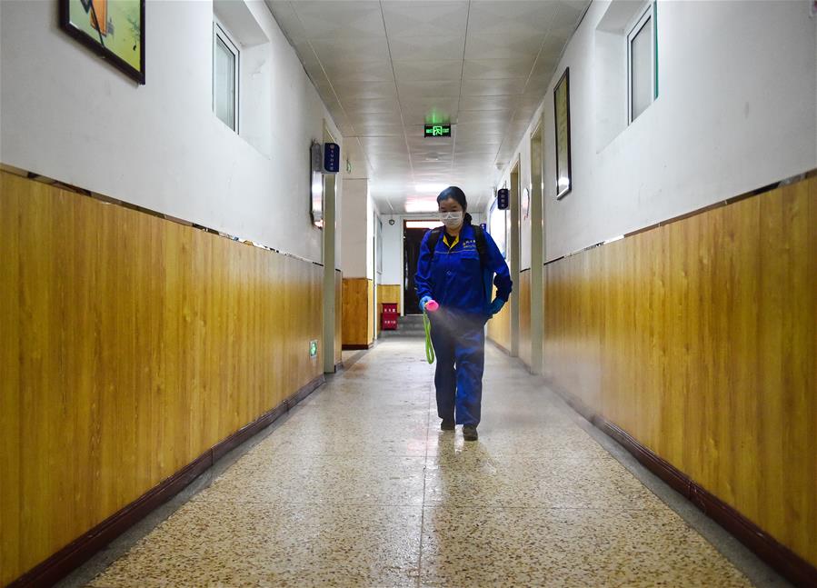 太原市杏花嶺區(qū)第一中學(xué),工作人員對(duì)樓道進(jìn)行消毒。