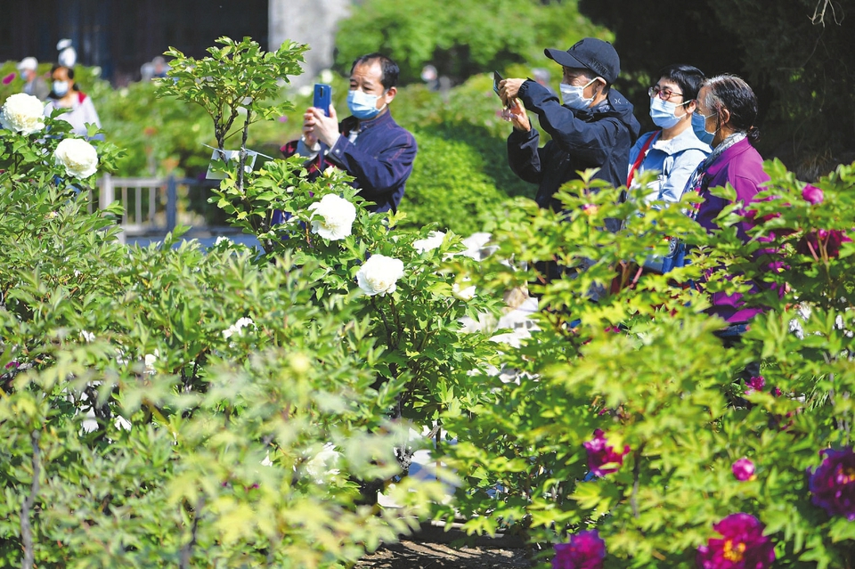 在雙塔博物館西南區的精品牡丹園內,9種顏色的牡丹“匯聚一堂”,分別來自菏澤、洛陽、蘭州等地,游客足不出“并”就能觀賞各色牡丹。再往西走,成片的牡丹花映入眼簾,仿佛穿越了千年的歷史時空,回到“唯有牡丹真國色,花開時節動京城”的盛唐時代,游客們爭相與牡丹花合影,構成一幅花海人潮的春游賞花風俗畫。