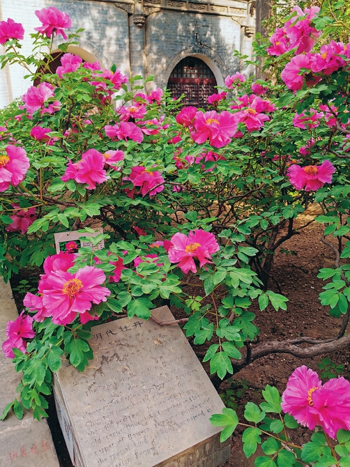 “在永祚寺內的6000多株牡丹中,這7株明代牡丹珍品‘紫霞仙’開得最早。”4月26日16時許,在永祚寺大雄寶殿前的花壇中,太原雙塔博物館工作人員王芳介紹,7株明代“紫霞仙”已有400多年的種植歷史,仿佛有靈性一般,它盛開了,寺內的其它牡丹才會陸續開放。可以說,“紫霞仙”是“花王”中的“花王”。