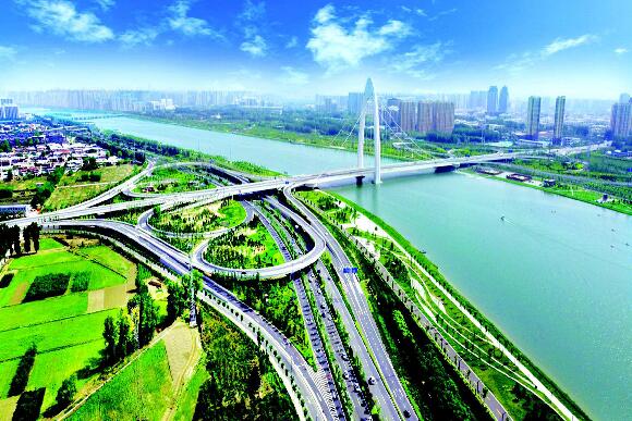 五月十七日,太原解放路改造工程北中環段,施工人員正在安裝吊裝到位的高架橋面。解放路北大街勝利街段橫跨北中環高架橋全長八百多米,是解放路改造工程的重要節點。目前,該橋基礎工程已完成近百分之九十。
