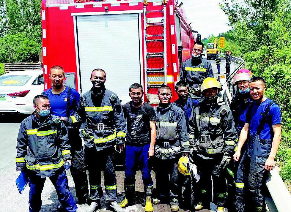 記者向徐峰了解到了照片背后的故事。23日一早,副中隊(duì)長(zhǎng)徐峰正帶著隊(duì)員們進(jìn)行早操,指針即將指向7時(shí),出警電鈴?fù)蝗豁懫?。徐峰和?duì)員們立即著裝登車,警笛陣陣,駛出消防站。目的地在二廣高速黃寨高速口以北,一輛運(yùn)輸化工原料的掛車起火。救援隊(duì)員到達(dá)現(xiàn)場(chǎng)時(shí),掛車上的貨已經(jīng)全部發(fā)生燃燒,失去搶救機(jī)會(huì),拖車(車頭)尚安全,駕駛室后方的氣罐已受到大火威脅。徐峰見狀,立即帶領(lǐng)隊(duì)員們,手持水槍,全力壓制明火向氣罐和拖車蔓延?!皻夤抟坏┰庥龈邷鼐拖裾◤?,我們必須全力保護(hù);車頭幾十萬(wàn),最核心部位,我們必須為車主保住?!绷已嬷丝?,濃煙熏嗆,隊(duì)員們寸步不動(dòng),堅(jiān)守陣地,終于將大火完全壓制,直至完全撲滅。烈焰熄滅,整裝返回,一臉黑、滿頭汗的隊(duì)員們站在一起拍了這張合影。(圖片由徐峰提供)