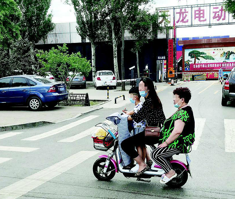 5月26日,三人共乘一輛電動(dòng)車行駛在和平北路上。此舉既不文明,也存在安全隱患。