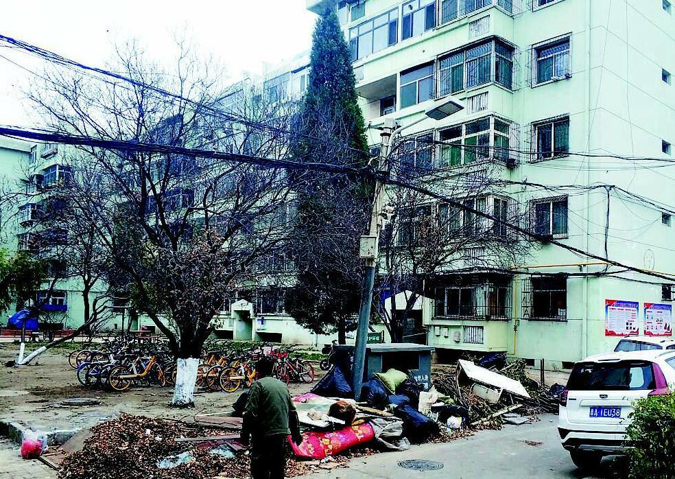 改造前的漪汾苑小區,雜物亂堆亂放,空中線纜和蜘蛛網一樣。