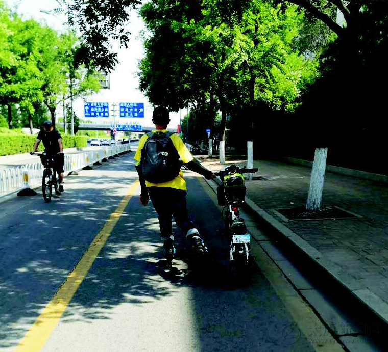 拍攝經過:6月8日,我在迎澤大橋南側的濱河東路上看到,一名男青年腳踩滑輪鞋單手推著自行車在非機動車道上快速向前滑行。如此“弄險”行為,引來不少路人側目。