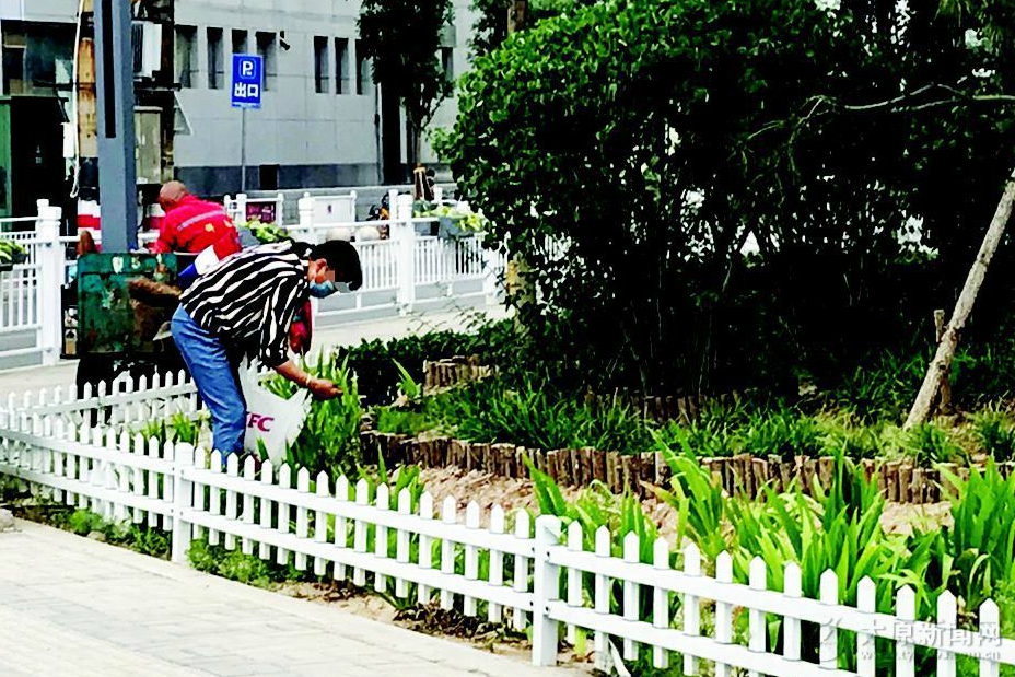 6月9日早晨8時,漪興路口的小游園里,一位女士跨進圍欄,在綠化帶里采摘“野菜”。踩踏城市公共綠地的行為不僅不文明,更重要的是,這些野菜受到汽車尾氣、污水、農(nóng)藥侵蝕,食用這些野菜可能會危害身體健康。 柴杰梁 攝