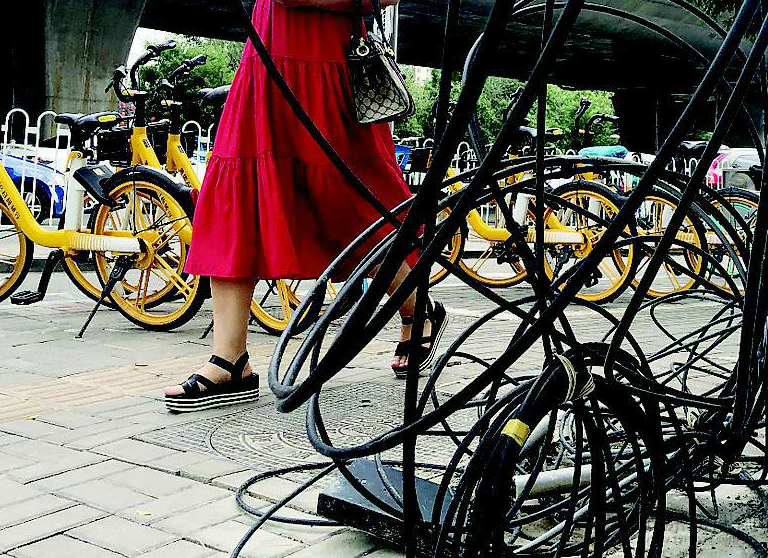 6月30日,省城南內環橋東,電纜線雜亂堆放在路旁,給行人的出行帶來安全隱患。鄧寅明攝