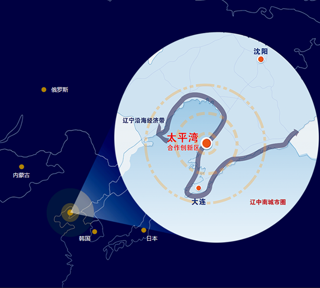 太平灣合作創新區地處東北經濟最活躍、交通最發達的沈大城市帶中間位置,環渤海經濟圈與東北亞經濟圈的中心位置,國家“一帶一路”、遼寧沿海經濟帶、東北老工業基地振興三大戰略的疊加區。