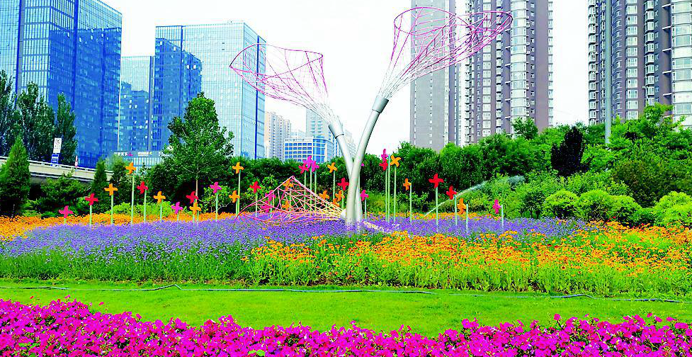 今年,市園林局結(jié)合“養(yǎng)管提升年”活動(dòng),加大了濱河?xùn)|西兩路互通綠地的提質(zhì)改造力度。針對(duì)濱河?xùn)|路南中環(huán)互通內(nèi)草坪退化的情況,提出了打造市區(qū)最大面積花海的構(gòu)思,為“玫瑰之都、浪漫之城”營(yíng)造氛圍。為達(dá)到最佳的視覺觀賞效果,對(duì)原有的植物進(jìn)行了整形修剪,增加了部分造型植物以及品種月季、觀賞草等。