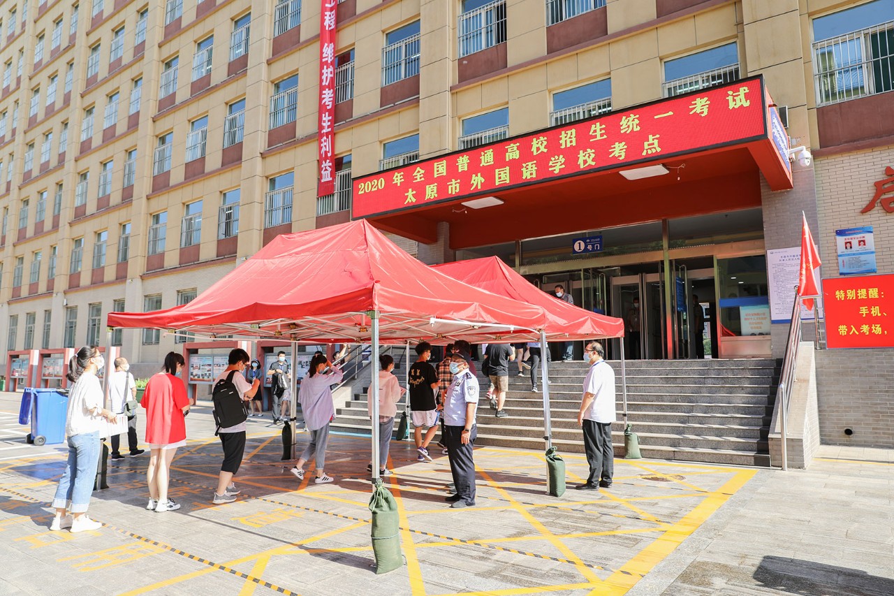 今年,各高考考點都采取了一系列措施,保障考生平安走進考場。在太原市外國語學??键c外,學校搭設了紅色的涼棚,幫助考生進入考點前,適當起到降溫防暑的作用,讓考生在測溫時溫度更加準確。此外,為避免聚集,學校還開放測溫門和3個測溫通道,讓學生快速通過體溫檢測進入考場。對于當下體溫偏高的考生,可以在體溫復檢區進行二次測溫。同時,根據疫情防控要求,考場還設有備用隔離考場。