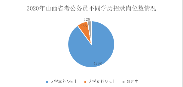 在2020年山西省國家公務員招錄職位中,大學本科及以上學歷崗位占比是最高的,共占89.78%,較去年增加了9%,共招錄4298個崗位,大學本科及以上的考生是2020年山西省省考招錄的“主力軍”。大學專科及以上共招錄355個,較去年減少了149個崗位。研究生共招錄128個,招考研究生學歷人數較去年減少2個崗位。