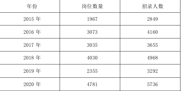從表中可以看出,近六年來山西省公務員考試崗位數量和招考人數,從15年開始每兩年的趨勢是先升后降的規律,在16年、18年、20年相較于上一年來說人數都會明顯上升。2020年是招錄崗位和招錄人數最多的一年,共招錄5736人。2015年則是招錄崗位和招考人數最少的一年。2020年上半年由于疫情的影響,在就業方面受到了一定的影響,政府通過招錄人才的方式來緩解就業壓力,因此2020年省考對于各位考生來說是非常不錯的機會,一定要把握住。