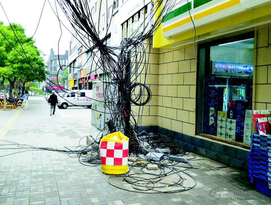 7月11日,菜園西街與新建南路交叉口往西二三十米處路南便道上,密密麻麻的線(xiàn)纜垂落在地,不但影響路人通行,還有礙市容市貌,希望產(chǎn)權(quán)部門(mén)盡快處理。