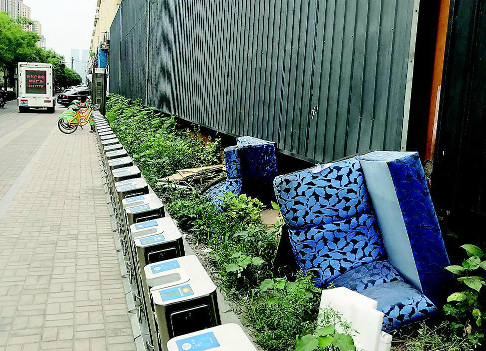 7月13日,文興路興華街口附近,一組破舊的沙發、木板被棄置在公共自行車站點旁,與周邊整潔的道路環境形成鮮明的對比。城市環境需要每位市民的愛護,如此隨意丟棄垃圾的行為太不文明。